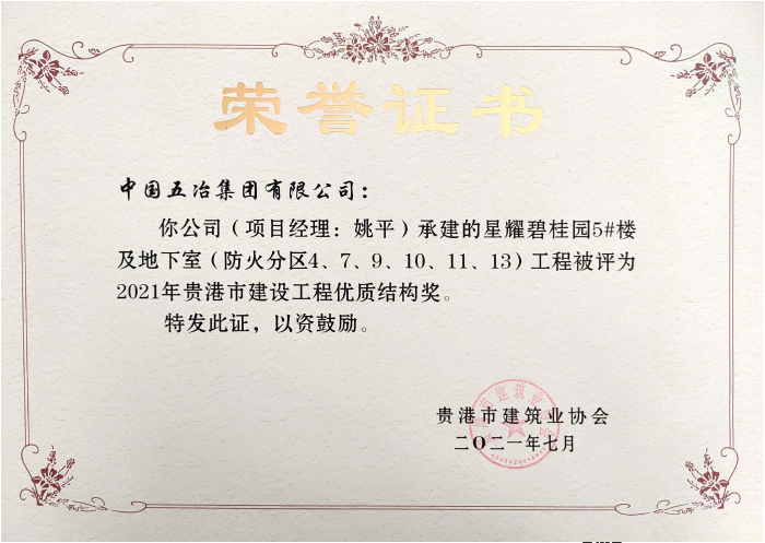 星耀碧桂園5#及地下室工程—2021年貴港市建設工程優(yōu)質結構獎