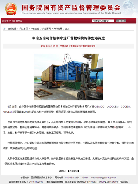 國資委報道:中冶五冶制作智利水泥廠首批鋼構構件集港待運