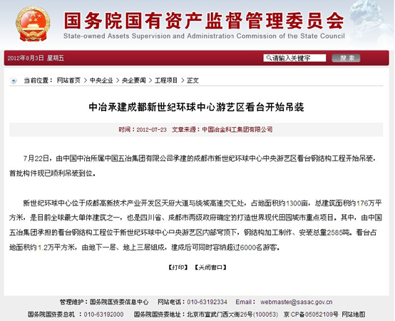 國資委報道:中冶承建成都新世紀環球中心游藝區看臺開始吊裝