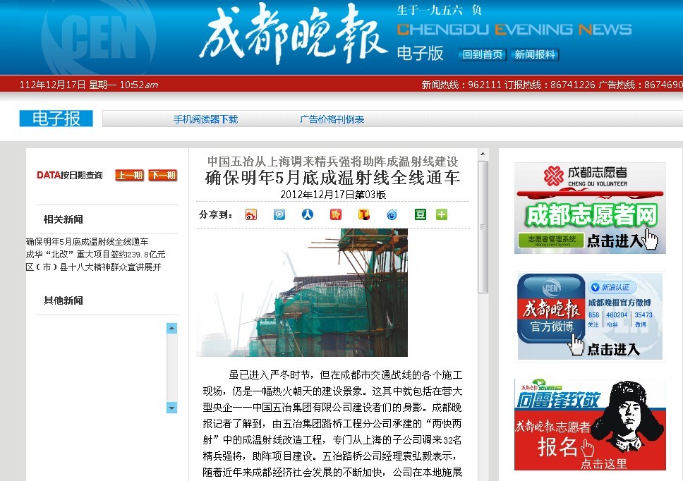 雖已進(jìn)入嚴(yán)冬時(shí)節(jié),但在成都市交通戰(zhàn)線的各個(gè)施工現(xiàn)場(chǎng),仍是一幅熱火朝天的建設(shè)景象。這其中就包括在 蓉大型央企——中國(guó)五冶集團(tuán)有限公司建設(shè)者們的身影。成都晚報(bào)記者了解到,由五冶集團(tuán)路橋工程分公司承建的“兩快兩射”中的成溫射線改造工程,專門(mén)從上海 的子公司調(diào)來(lái)32名精兵強(qiáng)將,助陣項(xiàng)目建設(shè)。五冶路橋公司經(jīng)理袁弘毅表示,隨著近年來(lái)成都經(jīng)濟(jì)社會(huì)發(fā)展的不斷加快,公司在本地施展拳腳的空間也越來(lái)越大, “我們有信心,為家鄉(xiāng)的建設(shè)不斷添磚加瓦。”