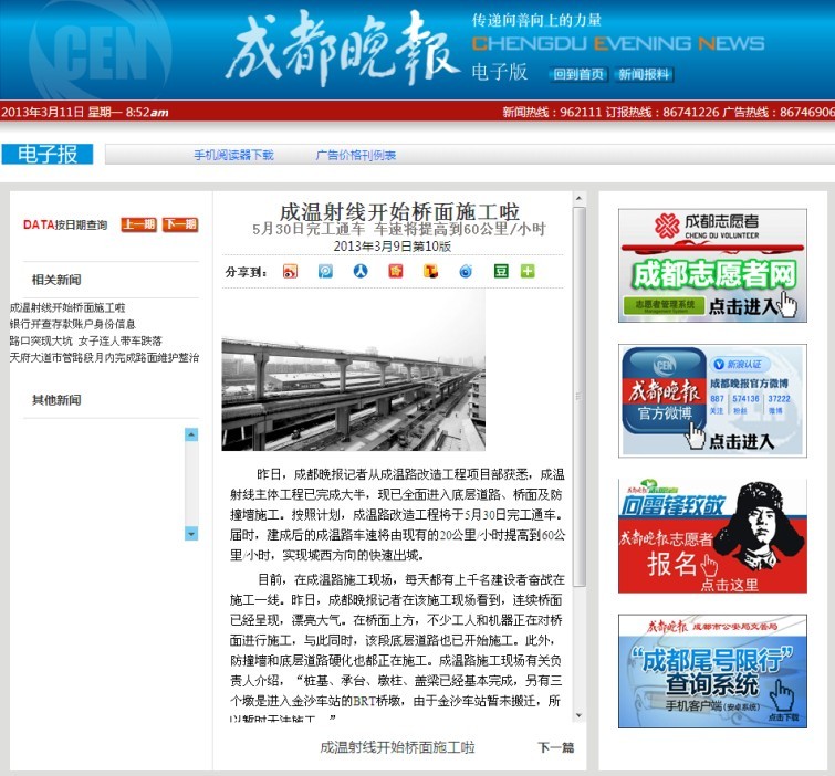 昨日,成都晚報記者從成溫路改造工程項目部獲悉,成溫射線主體工程已完成大半,現(xiàn)已全面進入底層道路、橋面及防撞墻施工。按照計劃,成溫路改造工程將于5月30日完工通車。屆時,建成后的成溫路車速將由現(xiàn)有的20公里/小時提高到60公里/小時,實現(xiàn)城西方向的快速出城。