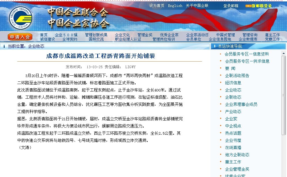 中國企業聯合會網報道:中國五冶集團成溫路改造工程瀝青路面開始鋪裝