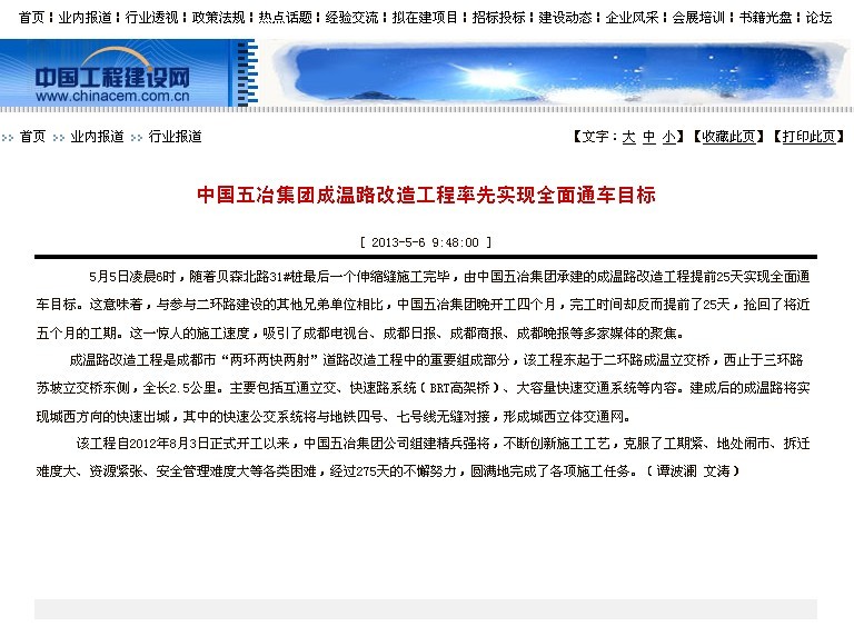 中國工程建設網報道:中國五冶集團成溫路改造工程率先實現全面通車目標