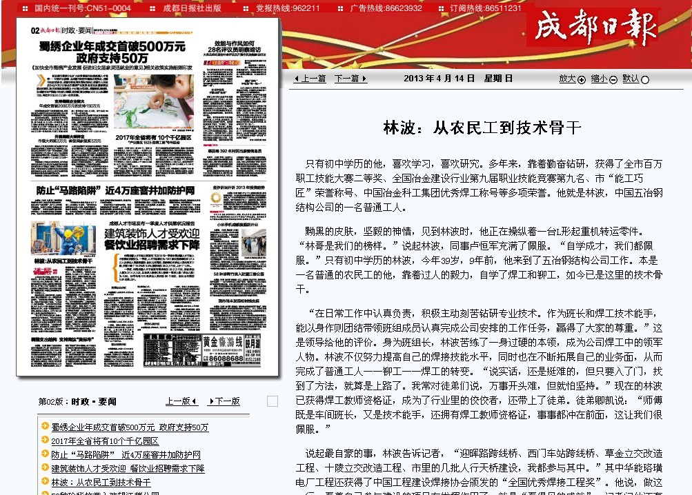說起最自豪的事,林波告訴記者,“迎暉路跨線橋、西門車站跨線橋、草金立交改造工程、十陵立交改造工程、市里的幾批人行天橋建設,我都參與其中。”其中華能珞璜電廠工程還獲得了中國工程建設焊接協會頒發的“全國優秀焊接工程獎”。他說,做這一行,看著自己參與建設的項目在發揮作用了,就是“看得見的成就”。記者問他還有什么“看不見的成就”,這位不善言辭的漢子笑著說,“老婆兒子都來成都了,生活比以前好多了。”雖然現在的他還在外面租房子住,但他的幸福很簡單,家人在身邊就好。面對成績和榮譽,林波顯得很淡定,“焊接好每一具構件,是自己的本職工作,只有每個焊縫都焊接合格,我們提供的產品才經得住考驗。”