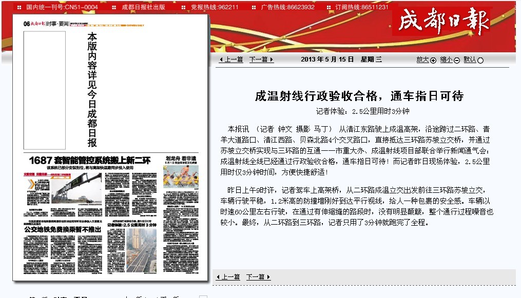 下一篇:天府早報報道:成溫路射線有望提前至月底通車