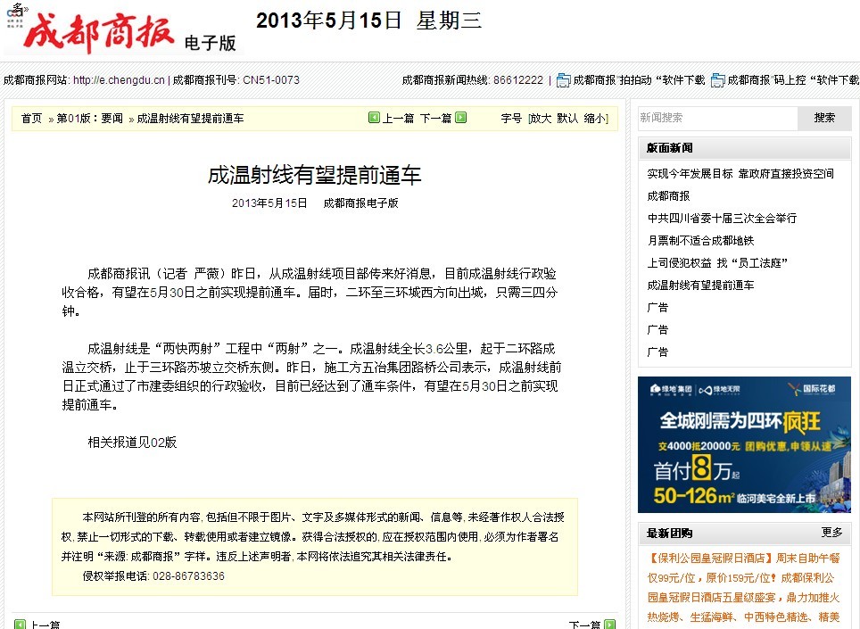 上一篇:華西都市報報道:成溫射線有望在30日前通車