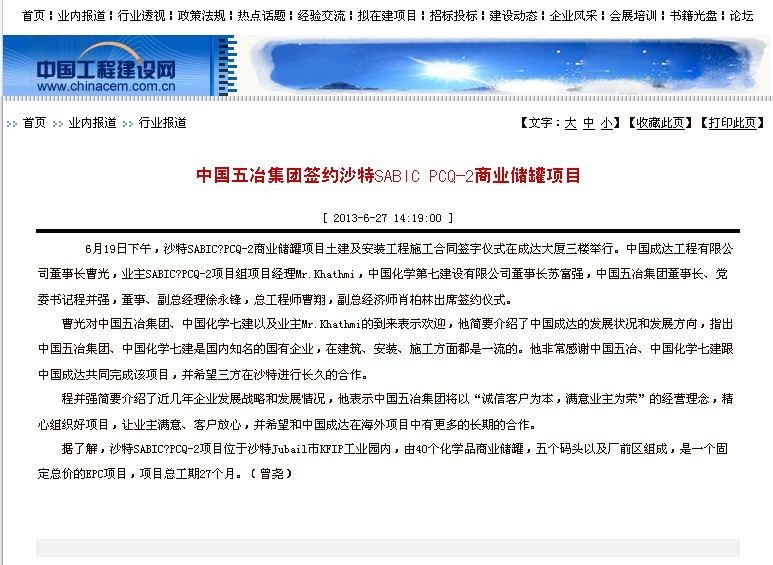 中國工程建設網報道:中國五冶集團簽約沙特SABIC PCQ-2商業儲罐項目