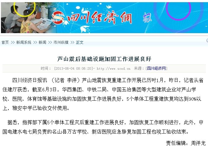 四川經濟日報報道:蘆山震后基礎設施加固工作進展良好