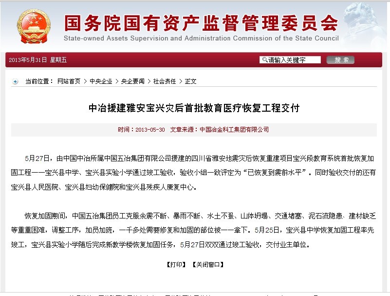 國資委報道:中冶援建雅安寶興災后首批教育醫療恢復工程交付