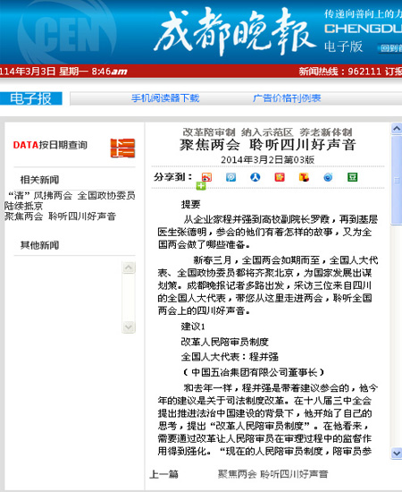3月2日,《成都晚報》以“聚焦兩會?聆聽四川好聲音”為題,報道了全國人大代表、中國五冶集團董事長、黨委書記程并強,對如何改革人民陪審員制度提出了自己的建議。