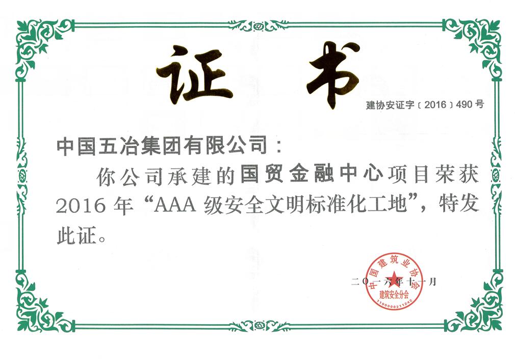 ? ?2016年12月,中國五冶集團新華之星”科研生產基地工程項目和國貿金融中心工程項目榮獲2016年全國“AAA級安全文明標準化工地”稱號。