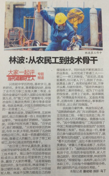 4月15日,成都市總工會(huì)聯(lián)合成都電視臺(tái)、成都廣播電臺(tái)、成都日?qǐng)?bào)、成都商報(bào)等成都市多家新聞媒體對(duì)當(dāng)代成都好工人候選人——鋼構(gòu)分公司三車(chē)間班長(zhǎng)、焊工林波進(jìn)行了采訪,錄制了“走基層——尋訪當(dāng)代成都好工人”節(jié)目,并在成都電視臺(tái)新聞綜合頻道(CDTV—1)《新聞18點(diǎn)》欄目中進(jìn)行宣傳報(bào)道。成都商報(bào)、成都日?qǐng)?bào)等媒體進(jìn)行了專(zhuān)題報(bào)道。