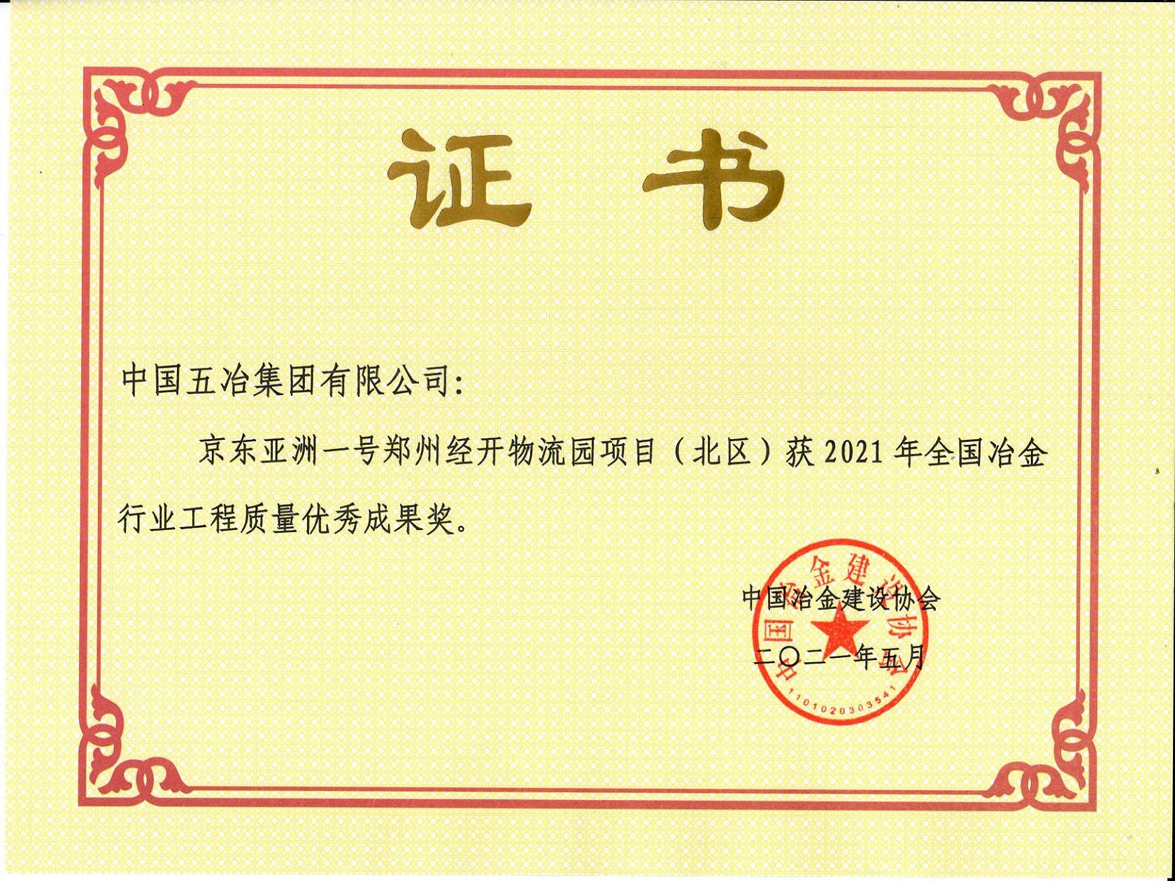 京東亞洲一號鄭州經(jīng)開物流園項目(北區(qū))榮獲2021年全國冶金行業(yè)工程質(zhì)量優(yōu)秀成果獎