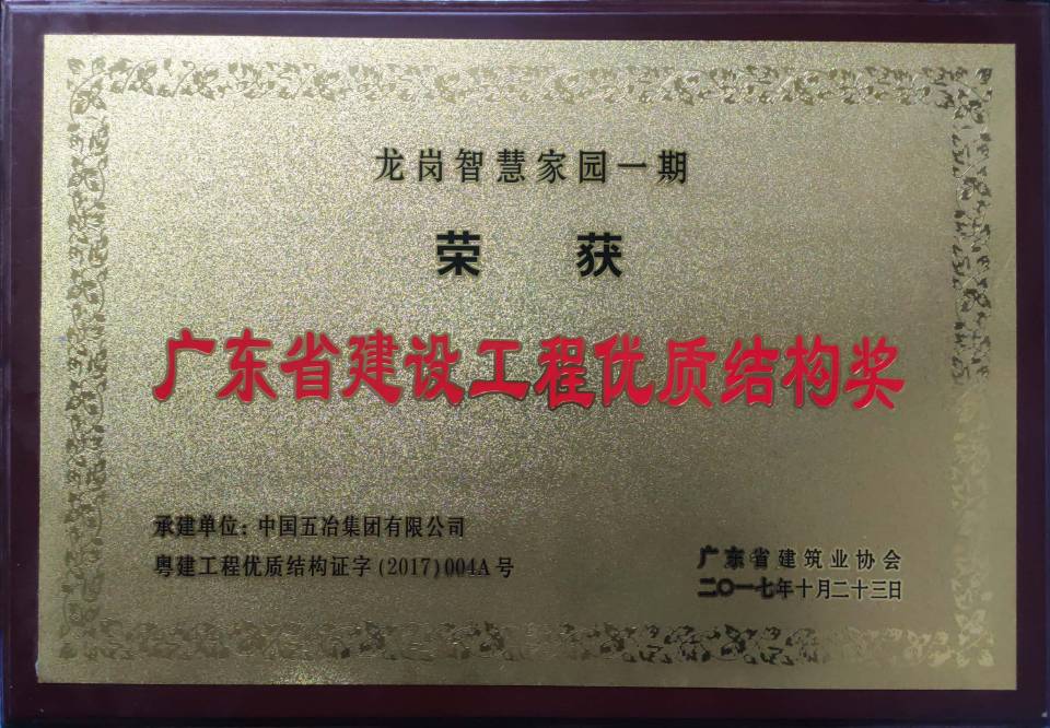 龍崗智慧家園一期工程評定為二零一七年廣東省建設工程優質結構獎