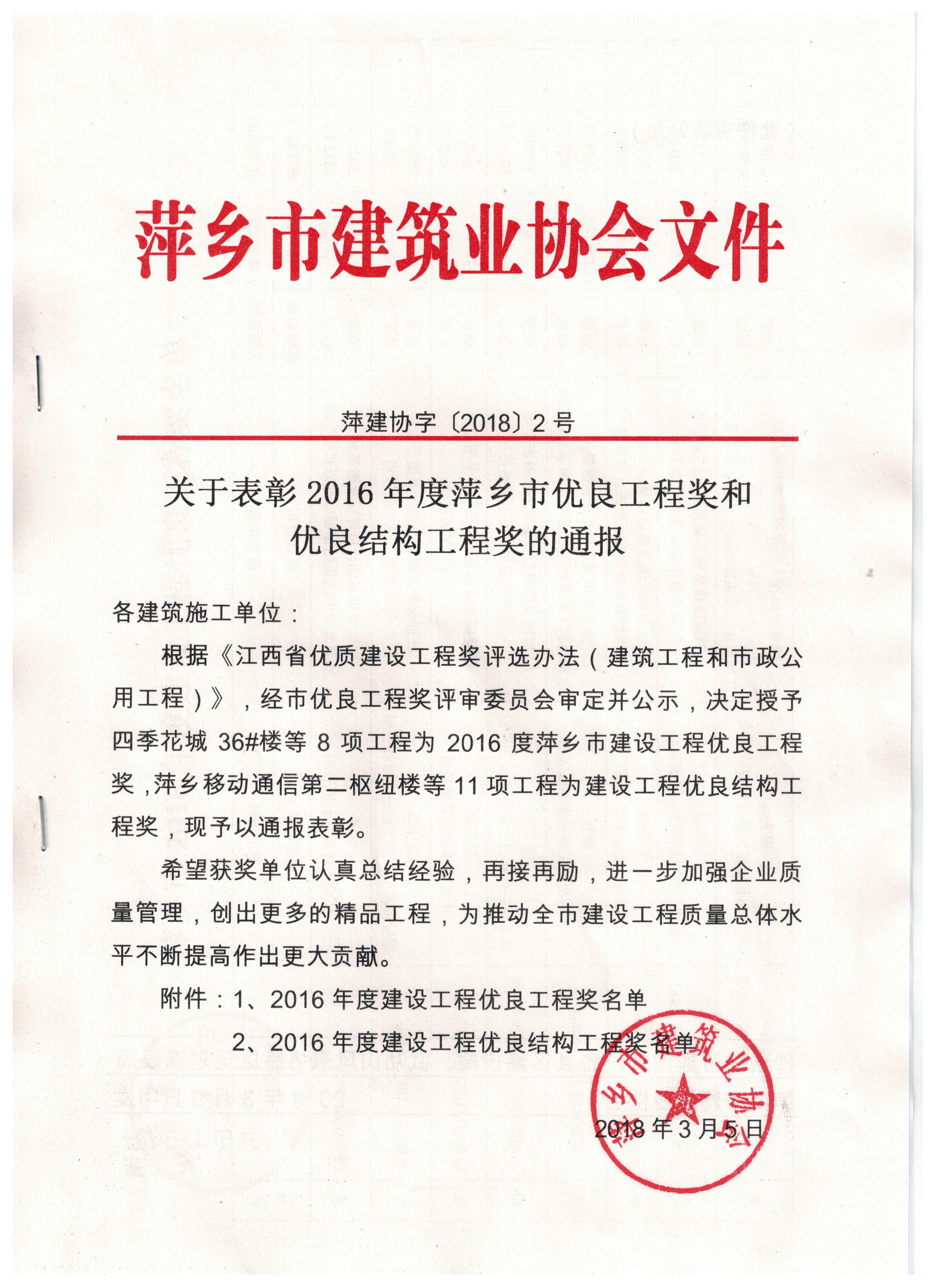 匯恒小區(qū)1#-8#樓及地下室工程榮獲2016年度萍鄉(xiāng)市建設(shè)工程優(yōu)良結(jié)構(gòu)工程獎(jiǎng)
