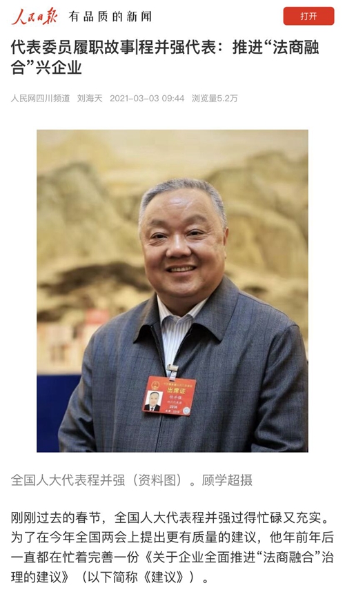 3月2日,人民網聚焦了程并強代表關于“關于企業全面推進‘法商融合’治理”的議案建議。