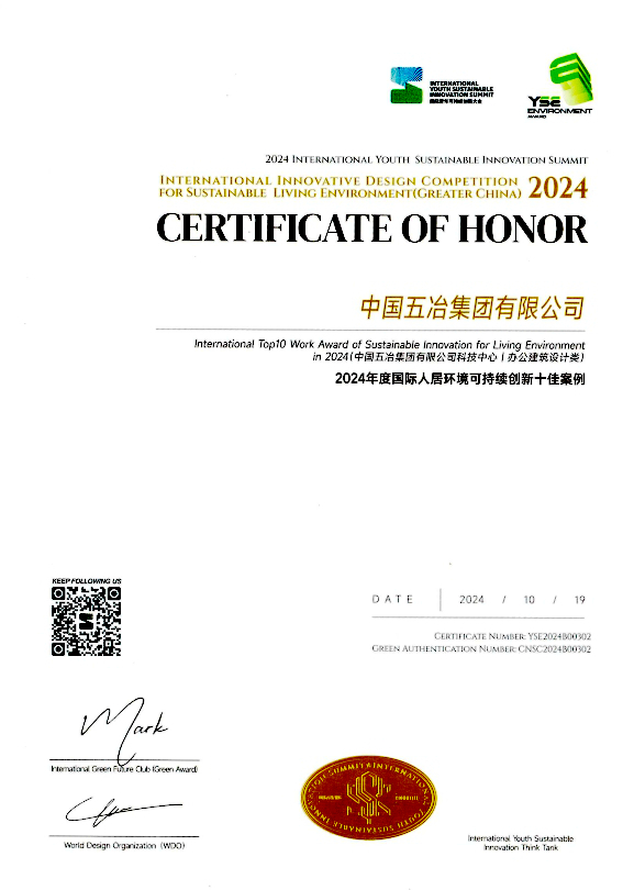 10月19日-20日,由中國科學技術協會指導,中國國土經濟學會主辦的2024國際青年可持續創新大會(YSS 2024)召開。會議現場,組委會聯合世界設計組織(WDO)、綠色未來俱樂部(德國綠獎)發布了2024國際人居環境可持續創新設計大賽(YSE Award)評比結果,中國五冶集團提交的五冶科技中心設計項目從全球1600余件參賽作品中脫穎而出,獲評國際人居環境可持續創新十佳案例,中國五冶集團獲評綠色可持續設計機構。