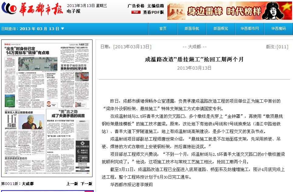 昨日,成都市緩堵保暢辦公室透露,負責承建成溫路改造工程的項目單位正為施工中首創(chuàng)的“梁體外設鋼桁架、懸掛施工”特殊支架施工方式申請國家專利。