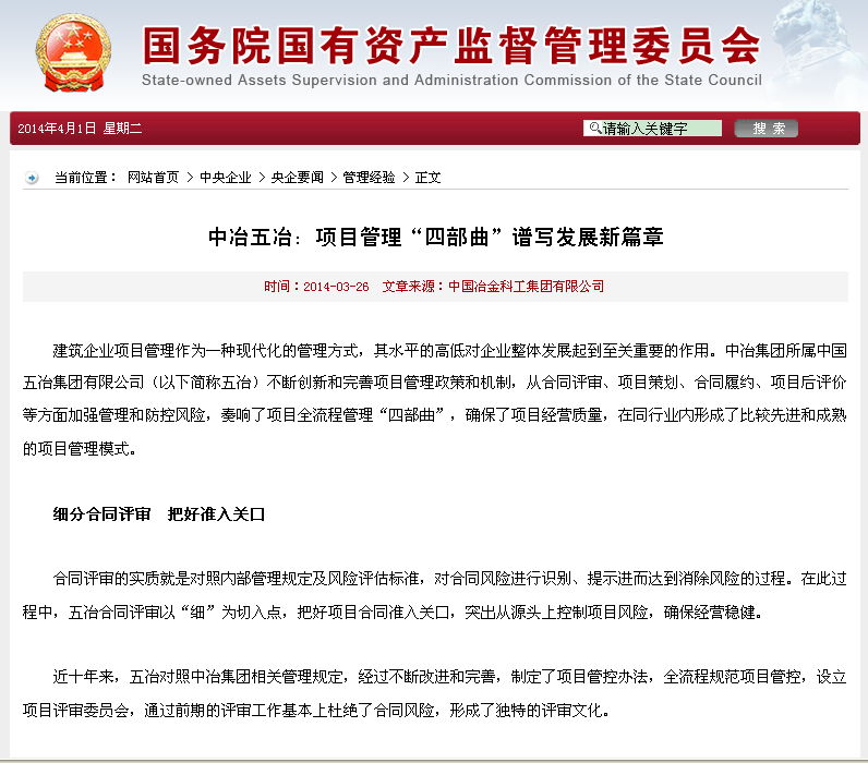 3月25日、26?日,國(guó)務(wù)院國(guó)資委官方網(wǎng)站、中國(guó)新聞網(wǎng)分別以“中冶五冶:項(xiàng)目管理‘四部曲’譜寫發(fā)展新篇章”和“中國(guó)五冶項(xiàng)目管理‘四部曲’確保項(xiàng)目經(jīng)營(yíng)質(zhì)量”為題,對(duì)中國(guó)五冶集團(tuán)近年來(lái)在項(xiàng)目管理過(guò)程中,取得的顯著成績(jī)從細(xì)分合同評(píng)審,把好準(zhǔn)入關(guān)口;推行項(xiàng)目策劃,模擬實(shí)戰(zhàn)演練;實(shí)施全面履約,確保經(jīng)營(yíng)成果;開(kāi)展項(xiàng)目后評(píng)價(jià),促進(jìn)管理再提升等四個(gè)方面,進(jìn)行了梳理和報(bào)道。