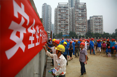 啟動儀式上,集團公司首先對安全生產月活動進行了動員,對安全生產月活動提出了相關要求。隨后,華興美廬項目部負責人帶領現場所有員工作出安全承諾;同時,集團公司團委向項目部授予了“青安崗”崗牌,并向項目部及職工贈送了安全掛圖和安全知識手冊。在安全知識有獎問答環節,現場的項目部員工和分包隊伍爭相回答主持人的提問,在贏得獎品的同時,再一次加深了對安全生產的認識。儀式最后,現場所有人員還進行了安全承諾簽名。