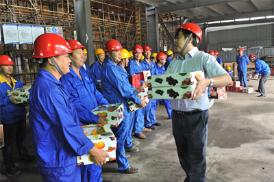 9月30日上午,正值祖國65歲華誕即將來臨之際,受中國五冶集團暨上海有限公司董事長、黨委書記程并強委托,上海有限公司領(lǐng)導(dǎo)徐永鋒、薛志群、汪忠旭、倪治壽及有限公司機關(guān)部門負(fù)責(zé)人一行來到寶鋼一期焦?fàn)t原地大修改造工程項目部,慰問奮戰(zhàn)在施工一線的廣大員工們,向他們送去節(jié)日慰問品,并祝愿他們節(jié)日愉快。