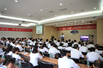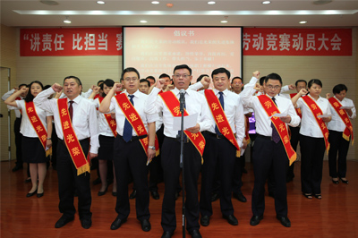 “認(rèn)真踐行‘打造競(jìng)爭(zhēng)優(yōu)勢(shì)’的發(fā)展文化、‘嚴(yán)細(xì)新實(shí)’的管理文化、‘敢擔(dān)當(dāng)看療效’的責(zé)任文化,充滿(mǎn)勇氣、充滿(mǎn)信心、充滿(mǎn)激情,奮力開(kāi)拓市場(chǎng)、全面提升產(chǎn)品、促進(jìn)經(jīng)營(yíng)創(chuàng)效,為實(shí)現(xiàn)‘轉(zhuǎn)型、提升、擴(kuò)張’戰(zhàn)略目標(biāo)而努力奮斗!”5月4日上午,中國(guó)五冶大廈三樓多功能廳和上海科技樓六樓大廳里掌聲雷動(dòng),一場(chǎng)以“講責(zé)任?比擔(dān)當(dāng)?賽貢獻(xiàn)”的主題演講和“比貢獻(xiàn)?看療效?保目標(biāo)”的勞動(dòng)競(jìng)賽動(dòng)員大會(huì)正在進(jìn)行。集團(tuán)公司領(lǐng)導(dǎo)、董事會(huì)秘書(shū)、總經(jīng)理助理、副三總師,集團(tuán)公司機(jī)關(guān)部門(mén)正副職、主管,四川地區(qū)各二級(jí)單位班子成員,上海有限公司班子成員,上海有限公司機(jī)關(guān)部門(mén)正副職、主管,上海有限公司各單位班子成員共三百余名參加。會(huì)議由集團(tuán)公司董事、總經(jīng)理蒙昌嘉主持。