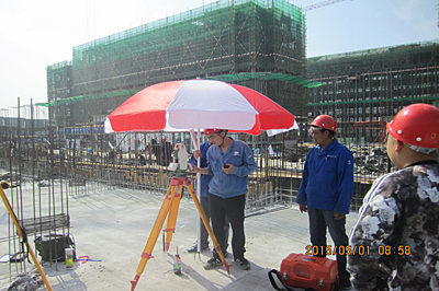 青島即墨藍(lán)色新區(qū)項(xiàng)目的同事正在烈日下測(cè)量樓層主控項(xiàng)線