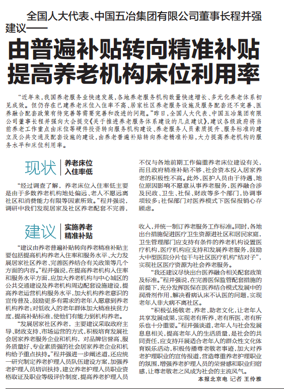 《香港商報網(wǎng)》記者以“大力提高養(yǎng)老機(jī)構(gòu)的服務(wù)水平和床位利用率”為題,從李克強(qiáng)總理的工作報告中“十三五”規(guī)劃綱要草案里有關(guān)“建立基本養(yǎng)老金合理調(diào)整機(jī)制;實現(xiàn)職工基礎(chǔ)養(yǎng)老金全國統(tǒng)籌等,完善職工養(yǎng)老保險個人賬戶制度;建立以居家為基礎(chǔ)的多層次養(yǎng)老服務(wù)體系等”出發(fā),就如何提高養(yǎng)老機(jī)構(gòu)服務(wù)水平,如何提高養(yǎng)老床位利用率等話題,對全國人大代表,中國五冶集團(tuán)董事長、黨委書記程并強(qiáng)進(jìn)行了專訪。