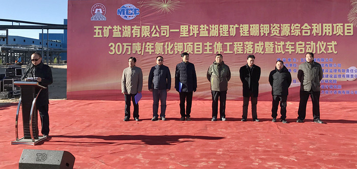 當(dāng)日,由中國五冶集團(tuán)有限公司承建的五礦鹽湖有限公司一里坪鹽湖鋰礦鋰硼鉀資源綜合利用項(xiàng)目(以下簡稱“一里坪鹽湖項(xiàng)目”)30萬噸/年氯化鉀項(xiàng)目主體工程落成暨試車啟動儀式在此舉行,標(biāo)志著一里坪鹽湖項(xiàng)目取得了重大階段性勝利。五礦鹽湖有限公司總經(jīng)理李增榮,副總經(jīng)理張大義、支雪斌,中國五冶集團(tuán)副總經(jīng)理程先云,以及設(shè)計(jì)、監(jiān)理單位相關(guān)負(fù)責(zé)人,中國五冶集團(tuán)成都機(jī)電公司相關(guān)人員等出席儀式,儀式由五礦鹽湖有限公司副總經(jīng)理侯昭飛主持。