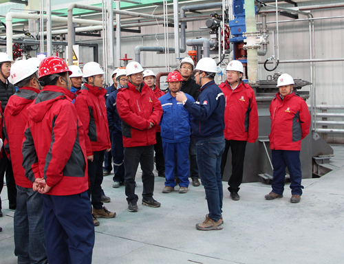 李連華一行視察了項目鹵水預處理車間、變配電及計控中心、沉鋰車間等施工現(xiàn)場,詳細了解了工程的施工進展情況,安全生產(chǎn)措施的落實情況及試車工作等相關事宜,對工程的進度、質(zhì)量和現(xiàn)場安全文明施工給予了肯定,同時希望大家要認真落實好中國五礦“大干一百天、確保兩翻番”的決策部署,確保項目履約。