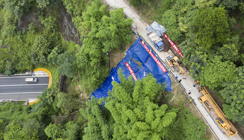 接到重慶市江北區規劃和自然資源局任務委托后,成勘公司立即集合精兵強將,連夜奔赴現場搶險。第一時間到達指定位置后,搶險項目團隊立即在滑塌區周邊采取斷道措施,設置警戒標志,確保行人安全,并對滑塌體表層的石塊及樹木進行細致清理,疏通滑坡體后側公路長約60米的水溝,同時在現有公路外側修筑5厘米高的混凝土擋塊,防止地表水從公路內側溢出到滑體后側,利用防水布將現有滑塌體及其臨近一定的區域進行遮蓋,防止雨水進入誘發二次滑塌。