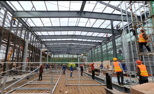 第1天,場地土方平整、柱基開挖、鋼結構預埋螺栓、柱基砼澆筑完成;第2天,地坪混凝土澆筑完成;第4天,鋼結構主體270噸吊裝完成;第5天,室內轉換鋼架及內外墻龍骨焊接完成,內外裝修全面展開;第7天,2300平方米屋面彩瓦鋪設完成;第11天,幕墻全部完成;第13天,內外裝修、PC板鋪裝、以及PC花崗石鋪裝完成……看著13天平地起高臺的速度和成績,項目指揮長王成軍激動地說:“大家擰成一股繩,不回家、不下線、不松勁,很多管理人員甚至連續兩天不睡覺盯現場,可謂一小時也不耽誤,一小時也不懈怠!業主都夸我們是善打硬仗、‘無所不能’的五冶人!”