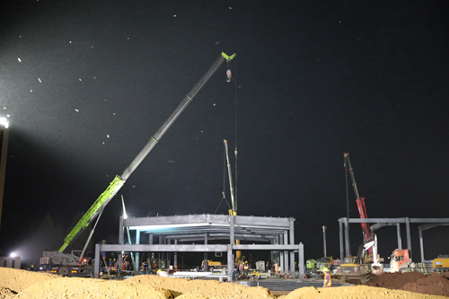 為將現場效能提升到極致,集團、分公司、項目部三級“戰隊”發揮精細化管控優勢,對現場急于施工的土建、鋼構、市政園林三個專業分設七個區,通過策劃與部署結合、管控與調度搭配,保證多個工序平行施工、見縫插針、多點開花。同時,依托五冶自身裝配式建造的巨大優勢,項目建設過程中90%以上應用裝配式技術,實現了工廠生產和現場裝配“兩頭熱”,在24小時輪班作業中創造出生產效率和履約速度的新高峰。