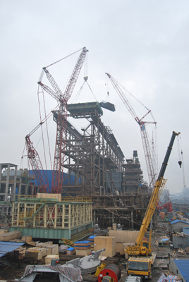 3月16日上午,由中國五冶集團上海有限機電公司承建的寶鋼焦爐干熄焦項目提升機臺架吊裝完成。