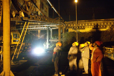 7月7日,沙鋼焦化一車間外的高壓電纜橋架因被吊車撞擊,立柱、橋架全部倒塌,電纜、水管、蒸汽管道等摔落在廠區(qū)道路上,其中部分電纜電壓高達(dá)10000V,嚴(yán)重威脅著人員、設(shè)備、車輛安全。同時,該橋架上的電纜直接影響到焦?fàn)t、除塵風(fēng)機、水熄焦泵的用電。五冶集團上海有限檢修公司在不影響生產(chǎn)的情況下對電纜橋架帶電修復(fù)。